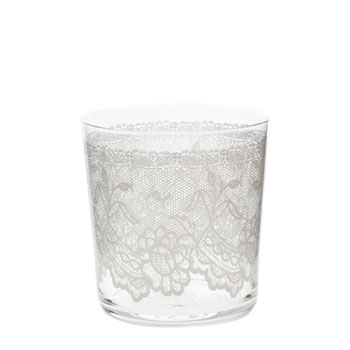 4.) Poner el encaje de la forma que más nos guste rodeando al bote de cristal. Fijarlo con cinta de carpintero o unas puntadas de hilo de algodón (la cinta puede dejar marca si no llevamos cuidado. Lo ideal es que el encaje tenga la misma dimensión del bote.